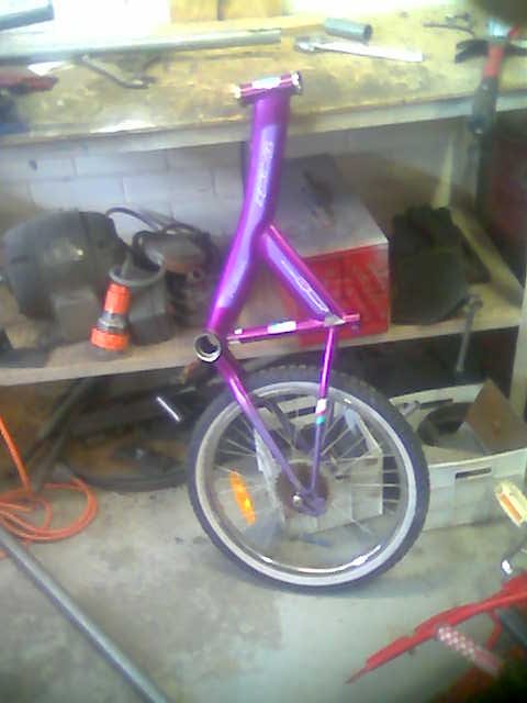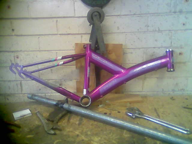 The purple is nice! The pink and white is ... less me. But hey, they're all getting sprayed black, so whatever. The initial plan was to take the rear triangle of the red and white, graft a couple of lengths of pipe onto it, attach the bottom bracket from the purple bike int he appropriate place, ditto the headstem, and we're away. It was going to be that way on the grounds that I wanted the bottom bracket and the headstem from the purple one to be the ones I used, because they looked better. Hah!