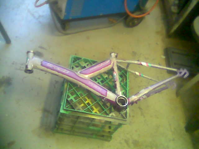 Half a day, basically, and tomorrow I'm ready to grind. Taking the front spars off, so just keeping the back triangle. Then I'll weld a spar up in a straight line from the top bar of that triangle (since that clean straight line is the heart of a chopper, to my mind), run another spar up from the bottom bracket, and where they meet I'll put a headstem. Add wheels & forks, and work out where to put the new bottom bracket. Hopefully, by the end of tomorrow, I'll have the frame welded, and ready for sandblasting. Hopefully :)Day 2!
