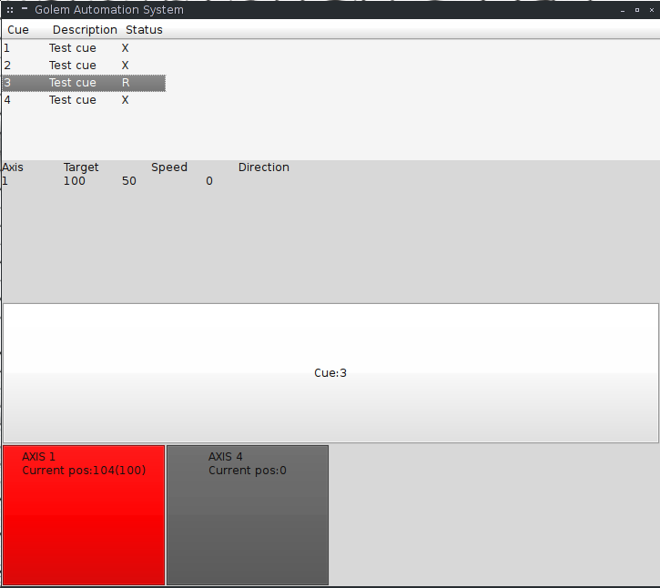 This is the current Master screen, which is basically running a show. Don't ask about the alignment of the Cue description stuff. Also, that's "Cue preview", not "Current target" - I really need to add a "Loaded cue" box that's more obvious than the "Cue preview". But hey, UI details. The Cue preview in this case does happen to match the loaded cue. The "R" in the Status column tells me I'm running Cue 3 - it should actually tell me I've finished Cue 3, because the axis has in fact stopped. You can see that Axis 1 has not hit its target - the deadband is set for 10 units, and it's just crept inside that. I need to update the display so that it takes that into account, but it'll do for the moment.