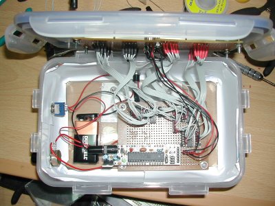 The heart of it is a Boarduino from the incomparable Lady Ada. The Boarduino is absolute overkill, but given that I have little patience for assembly language these days, and even less patience for setting up and massaging microcontroller programming environments, the Boarduino or Arduino saves me time and effort. A good rigger is a lazy rigger! There are some 74HC164 shift registers in there to keep it company, because they're what I had lying around. Version 2 will have a MAX7221, or at least some proper shift registers, but hey, you work with what you have.